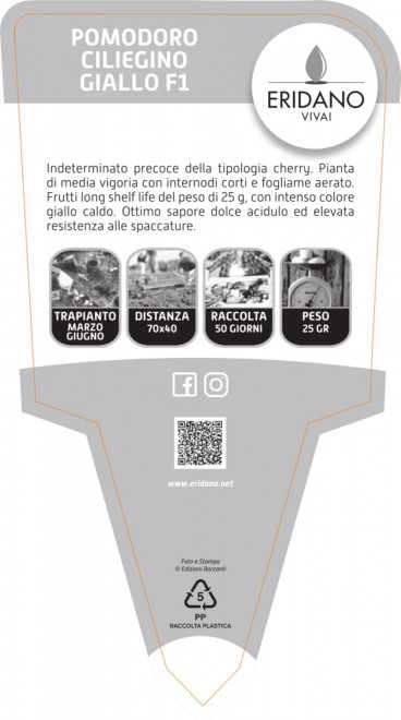 Indeterminato precoce della tipologia cherry. Pianta di media vigoria, con internodi corti e fogliame areato. Frutti long shelf life dal peso di 25 g, con un intenso colore giallo caldo. Ottimo sapore dolce acidulo ed elevata resistenza alle spaccature.